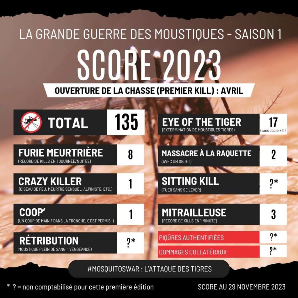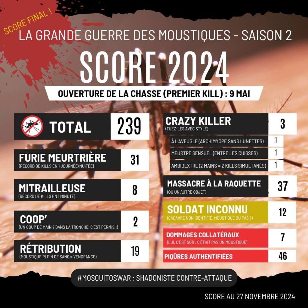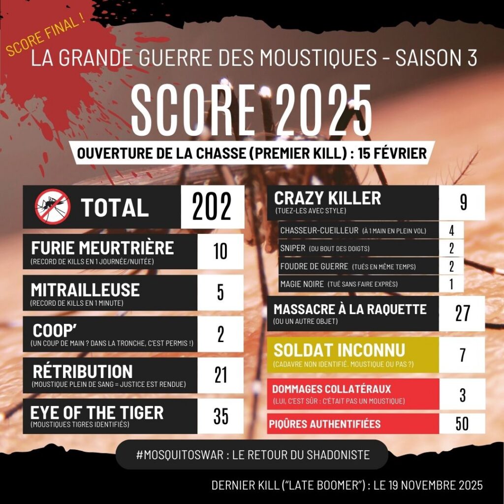Idée pour la suite – donnée par une autre personne (vous vous rendez compte combien mon entourage me soutient dans mon délire ?) – : noter ma performance, avec le taux de moustiques tués/ratés ? On verra…